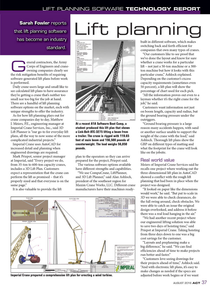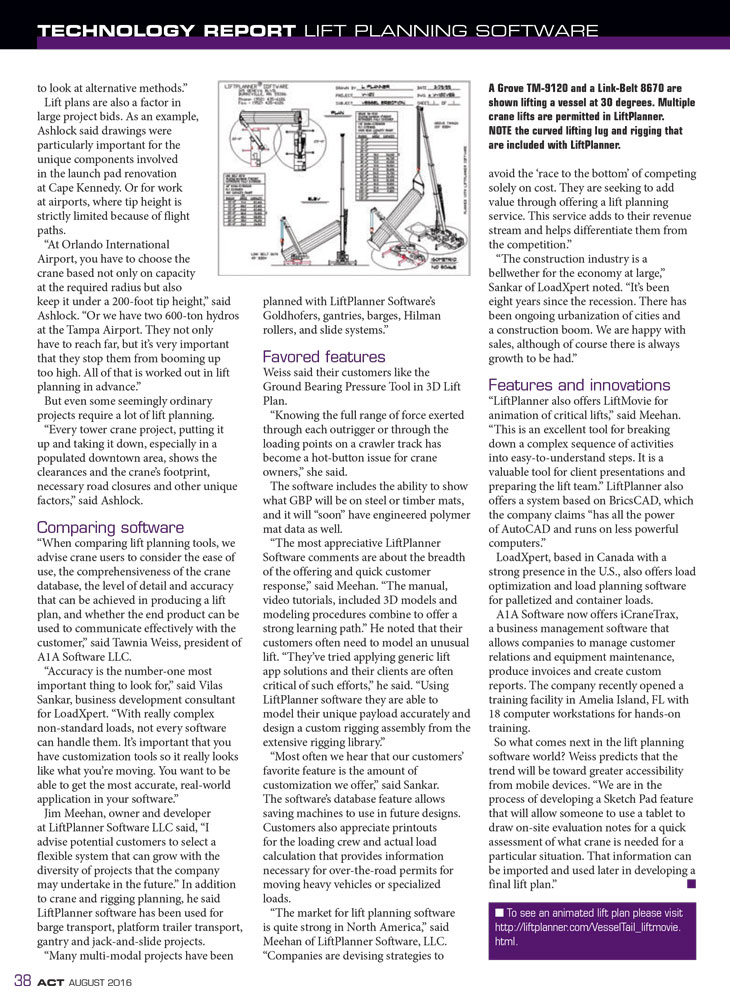 “When comparing lift planning tools, we advise crane users to consider the ease of use, the comprehensiveness of the crane database, the level of detail and accuracy that can be achieved in producing a lift plan, and whether the end product can be used to communicate effectively with the customer,” said Tawnia Weiss, president of A1A Software LLC.